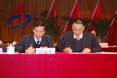 公司黨委書記李世龍與集團公司黨委書記張海平(左一)簽訂2010年黨委目標考核責任書