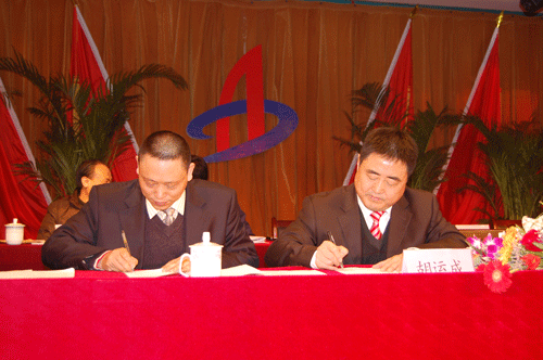 公司李世龍總經(jīng)理與集團董事長胡運成(右一)簽訂2010年經(jīng)營、安全目標考核責任書