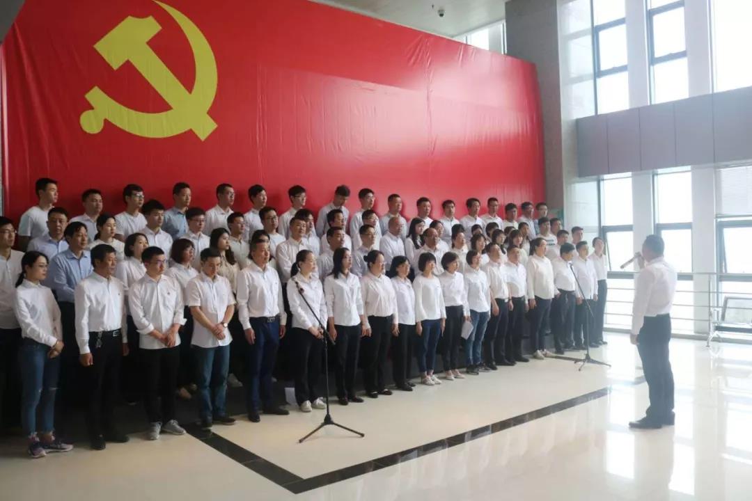 機關(guān)全體黨員職工面向黨旗,莊嚴(yán)地舉起右手,在黨委書記、董事長李世龍的帶領(lǐng)下,以飽滿的熱情、嘹亮的歌聲高唱《我宣誓》,并集體表態(tài)“不忘初心齊奮進,牢記使命我先行”。