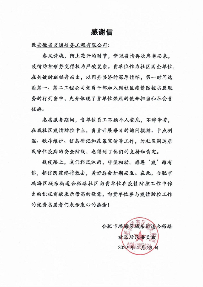 “第一時(shí)間選派第一、第二工程公司黨員干部加入到社區(qū)疫情防控志愿服務(wù)的行列當(dāng)中,充分體現(xiàn)了貴單位強(qiáng)烈的使命擔(dān)當(dāng)和社會責(zé)任感?!?月29日,公司收到了一封來自合肥市瑤海區(qū)城東街道合裕路社區(qū)的感謝信,信中對公司積極參與社區(qū)疫情防控工作表示由衷感謝。
