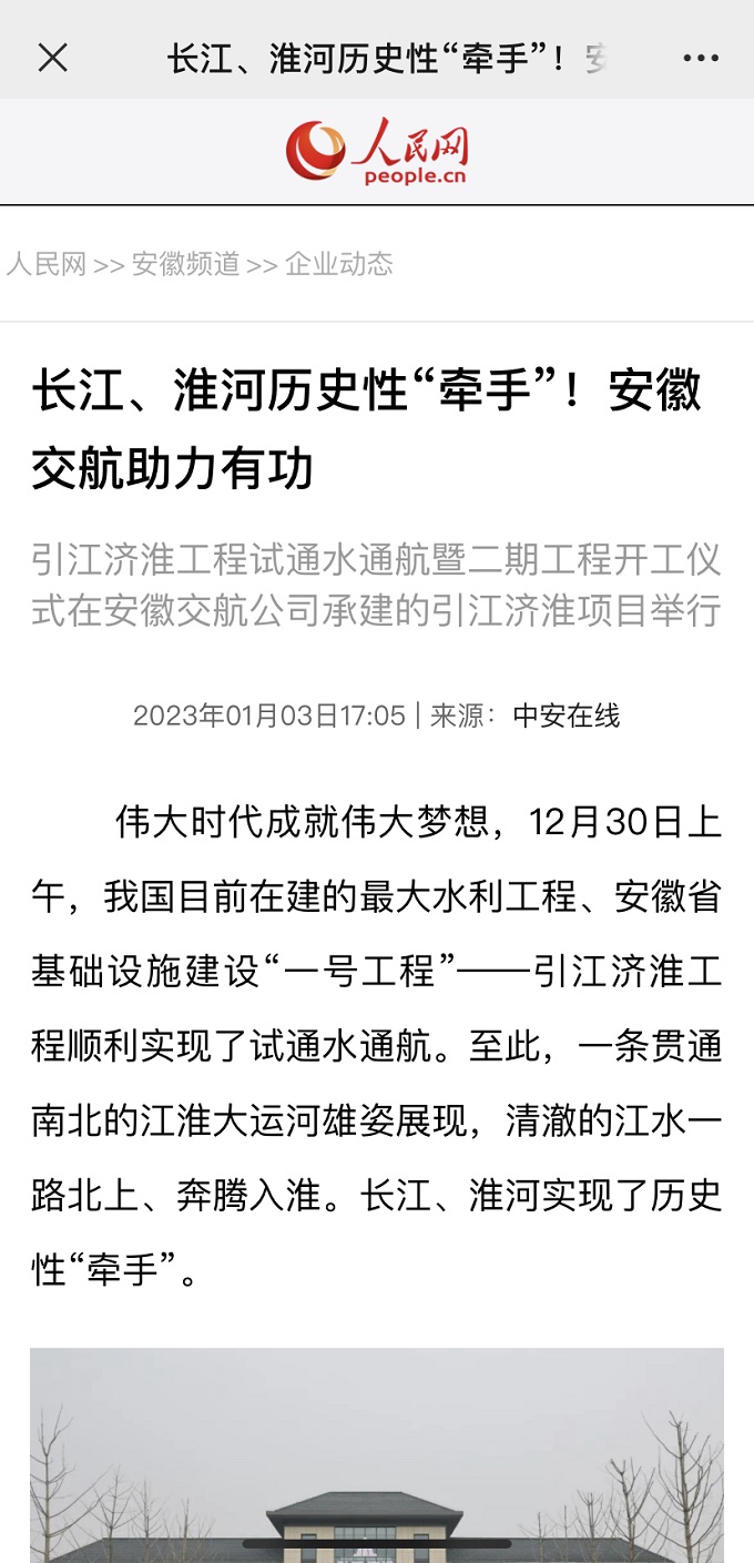 人民網(wǎng)安徽頻道發(fā)布報(bào)道引江濟(jì)淮工程試通水通航暨二期工程開工儀式在安徽交航公司承建的引江濟(jì)淮項(xiàng)目舉行。